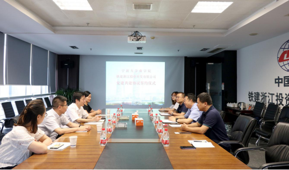 签约仪式上,双方党委书记分别介绍了各自党建工作特色,共同观看了企业宣传片。双方约定,今后的党建共建工作中,将以资源共享、优势互补、深度融合、共同提高为原则,共享党建载体、共造党建环境、共创党建品牌。积极探索党建共联共建新思路,双方就加强加深党建品牌活动、人才培养合作、实践基地服务、培训交流项目、社会公益活动等多个方面进行了深入交流,达成合作共识,构筑了党建提升、共建合作新格局。最后,铁建浙投党委书记吴向东对我院一行人员表达了感谢,希望在与智者同行的过程中,以高质量的党建工作引领企业高质量发展,校企携手,不断推进党建工作迈上新台阶。